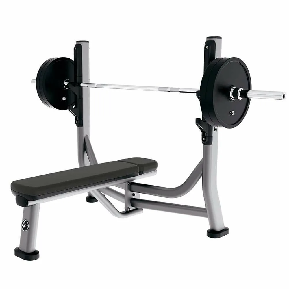 The Life Fitness Signature Olympic Flat Bench features moulded urethane protective racking that limits noise and protects the bar from wear for a stable and precise workout. It has an adjustable kneepad to accommodate users of all sizes.